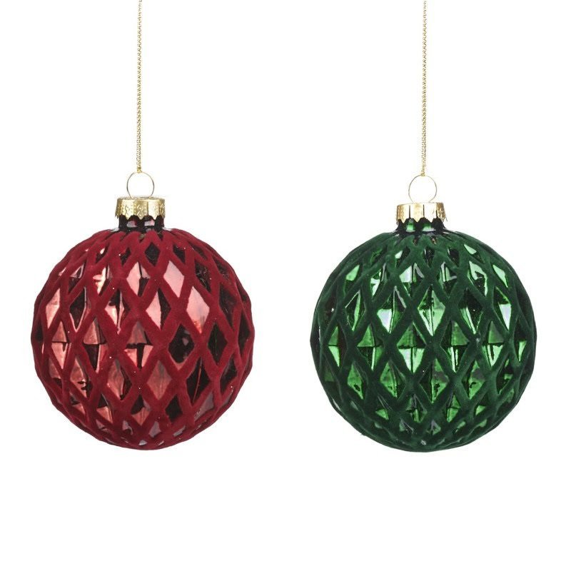 КОЛЕДНИ ГИГРАЧКИ ЗА ЕЛХА 2 МОДЕЛА СТЪКЛЕНИ 3D ТОПКИ С РОМБОВЕ 8СМ ЦЕНАТА Е ЗА ЕДИН БРОЙ ЦВЯТ; ЧЕРВЕНА И ЗЕЛЕНА МАТЕРИАЛ; СТЪКЛО, МЕТАЛ, БРОКАТ