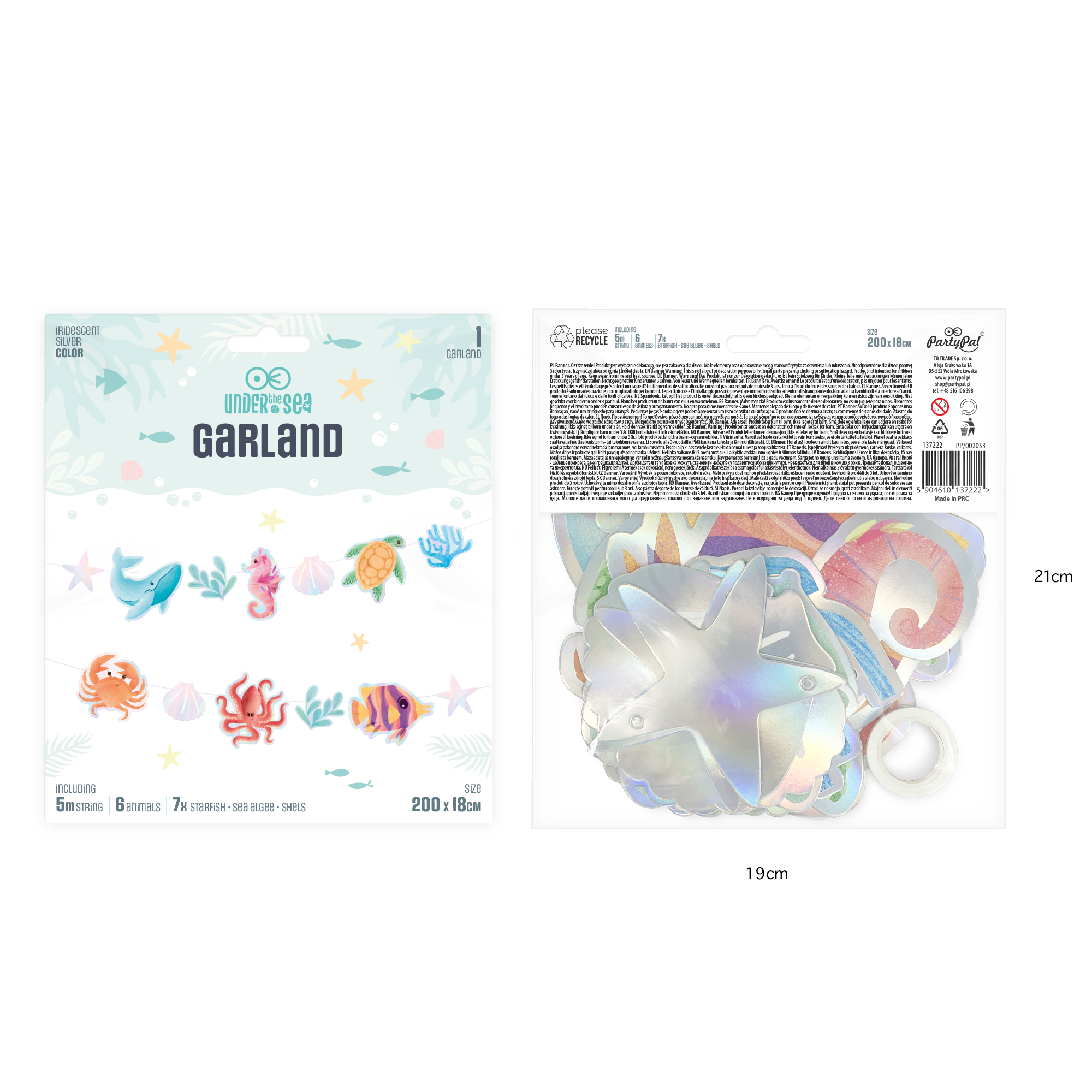 Съчувстващи персонажи: кит, морско конче, костенурка, рак, октопод и риба ви канят в подводния свят. Гирляндата от колекцията Ocean е чудесна украса за детски партита, украсявайки с цветове и ирисцентни аксесоари. Ширина: приблизително 200 см Височина на елементите: 10-18 см Гирляндата се състои от 6 цветни животни и 7 допълнителни елемента: морски звезди, миди, корали …