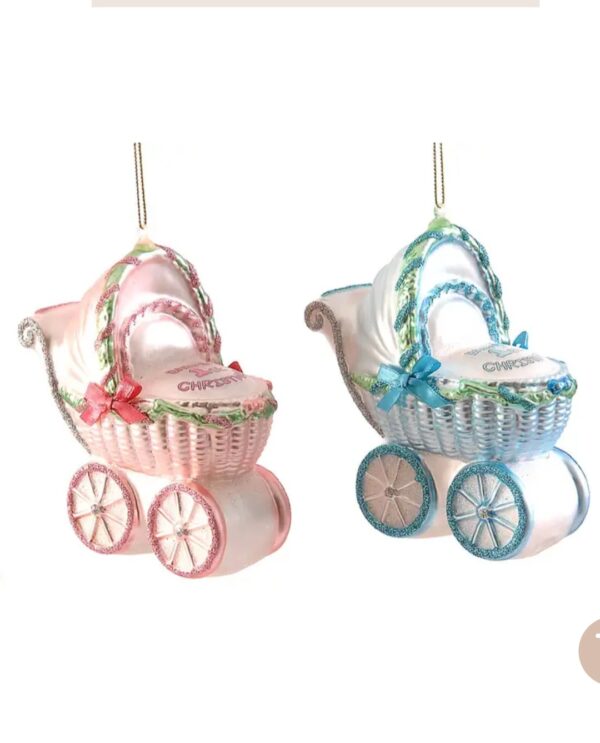 КОЛЕДНА ИГРАЧКА ОТ СТЪКЛО -БЕБЕШКА КОЛИЧКА В ДВА ЦВЯТА