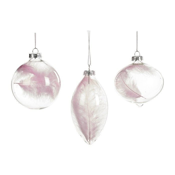 Основна/ПАРТИ ТЕМИ/КОЛЕДА И НОВА ГОДИНА/СТЪКЛЕНИ ИГРАЧКИ С БЛЕДО РОЗОВИ ПЕРА ЗА ЕЛХА 8СМ. ТРИ МОДЕЛА