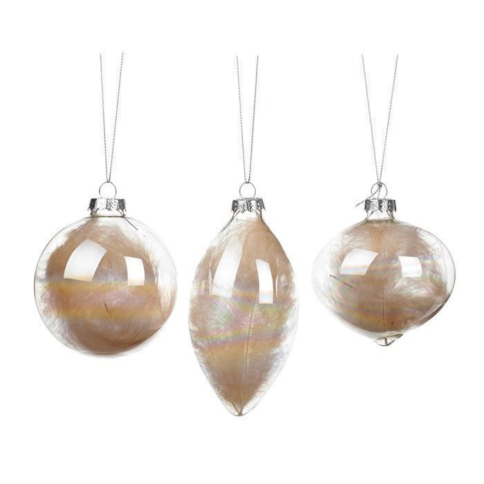 СТЪКЛЕНИ ИГРАЧКИ С ПЪЛНЕЖ ОТ ПУХ ЗА  ЕЛХА 8СМ. ЦВЯТ; ПРОЗРАЧНА С КРЕМАВИ ПЕРА МАТЕРИАЛ; СТЪКЛО, ПУХ, МЕТАЛ АРТИКУЛ: P-31479