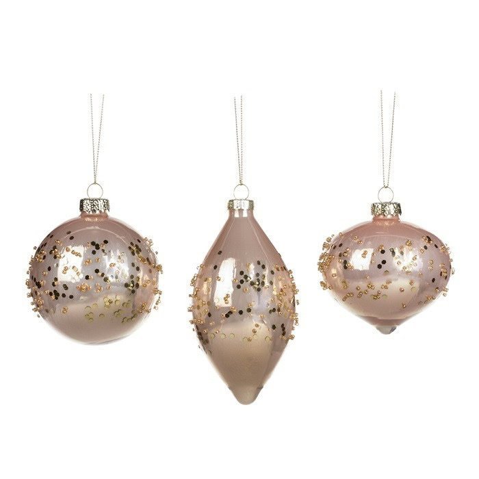 СТЪКЛЕНИ ИГРАЧКИ С МЪНИСТА ЗА  ЕЛХА 8СМ. ЦЕНАТА Е ЗА ЕДИН БРОЙ ЦВЯТ;  БЛЕДО РОЗАВО И ЗЛАТНО МАТЕРИАЛ; СТЪКЛО, МЪНИСТА, МЕТАЛ АРТИКУЛ: P-31506